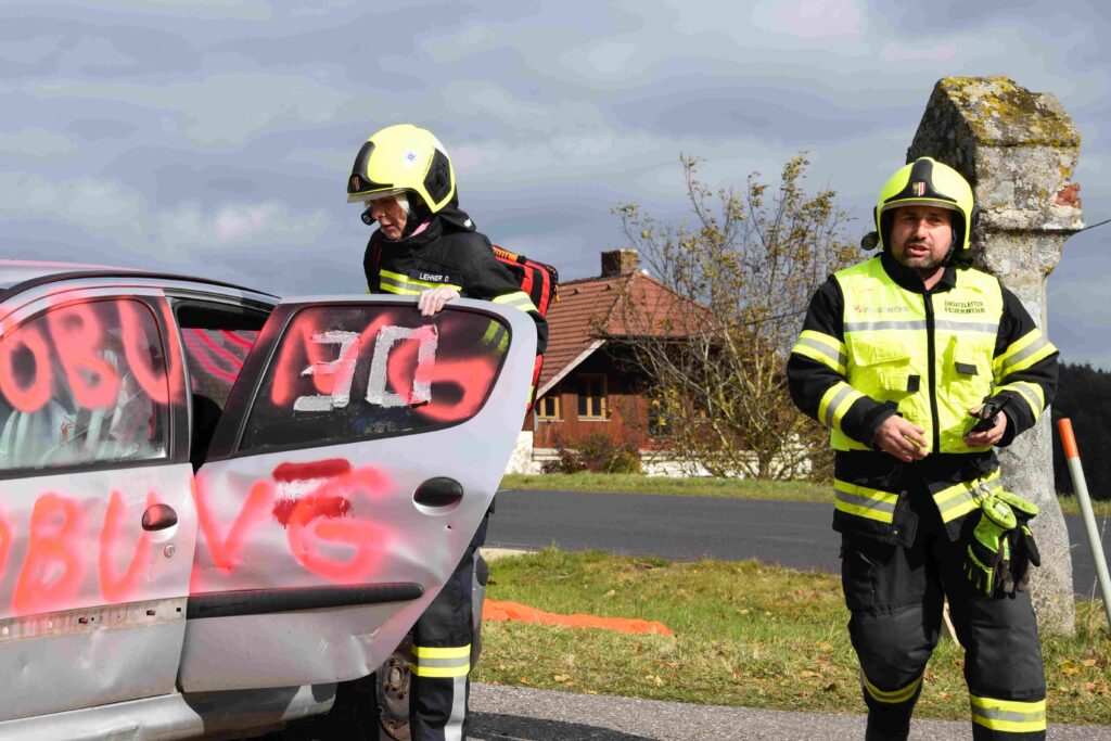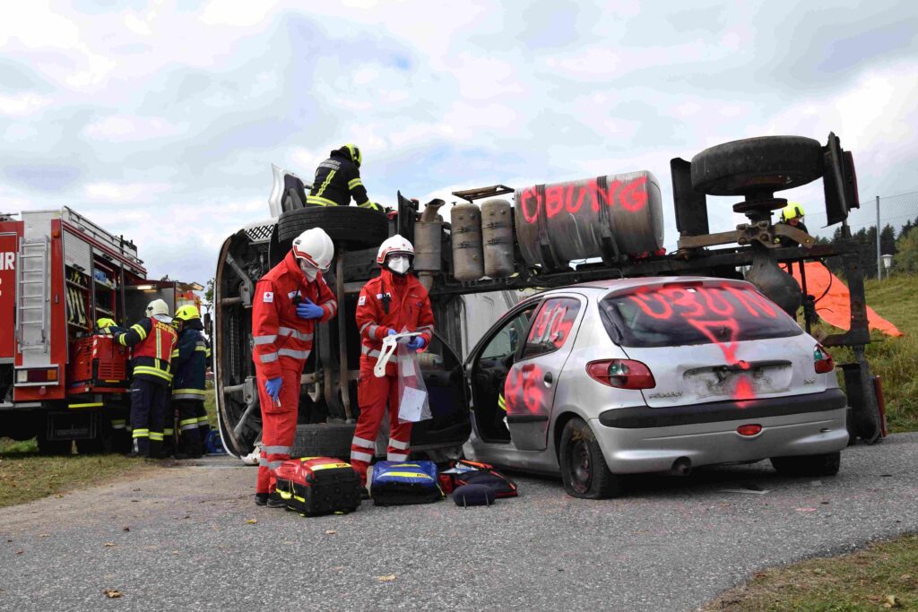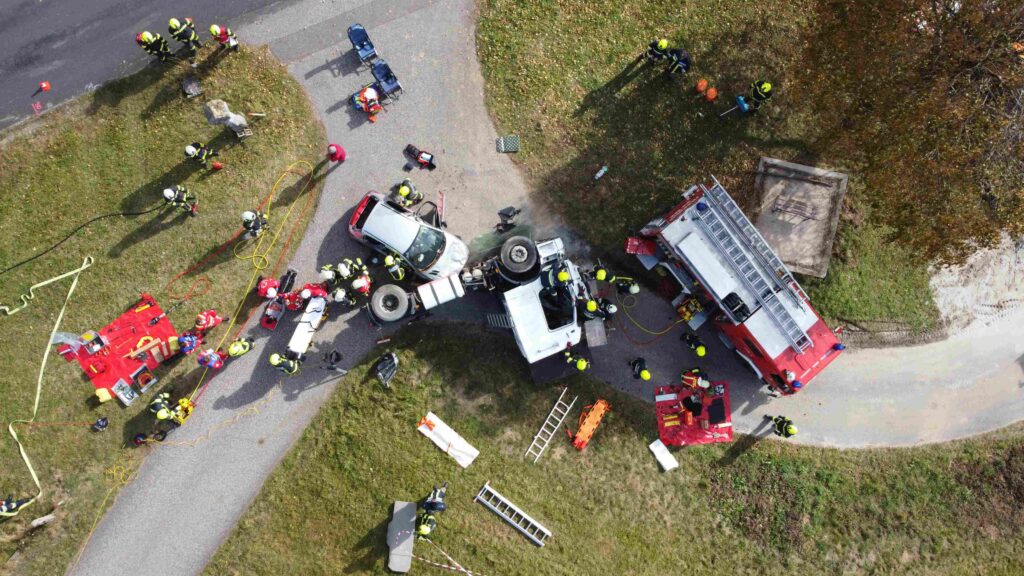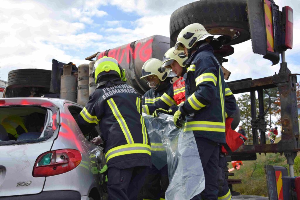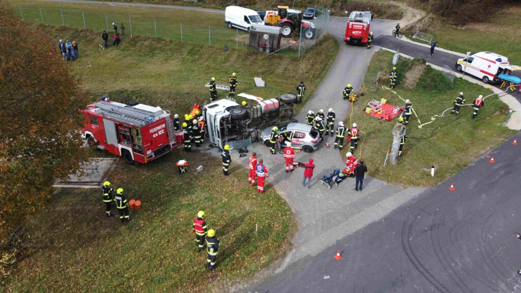 Ein heftiges Szenario stand für die Herbstübung 2021 in Erdmannsdorf am Programm: Schwerverletzte und eingeklemmte Verkehrsverunfallte mussten darum fürchten, dass die Kraftfahrzeuge auch noch in Feuer aufgehen.