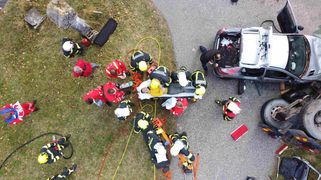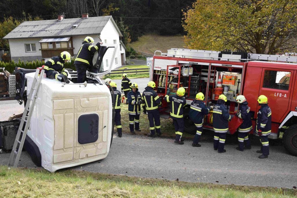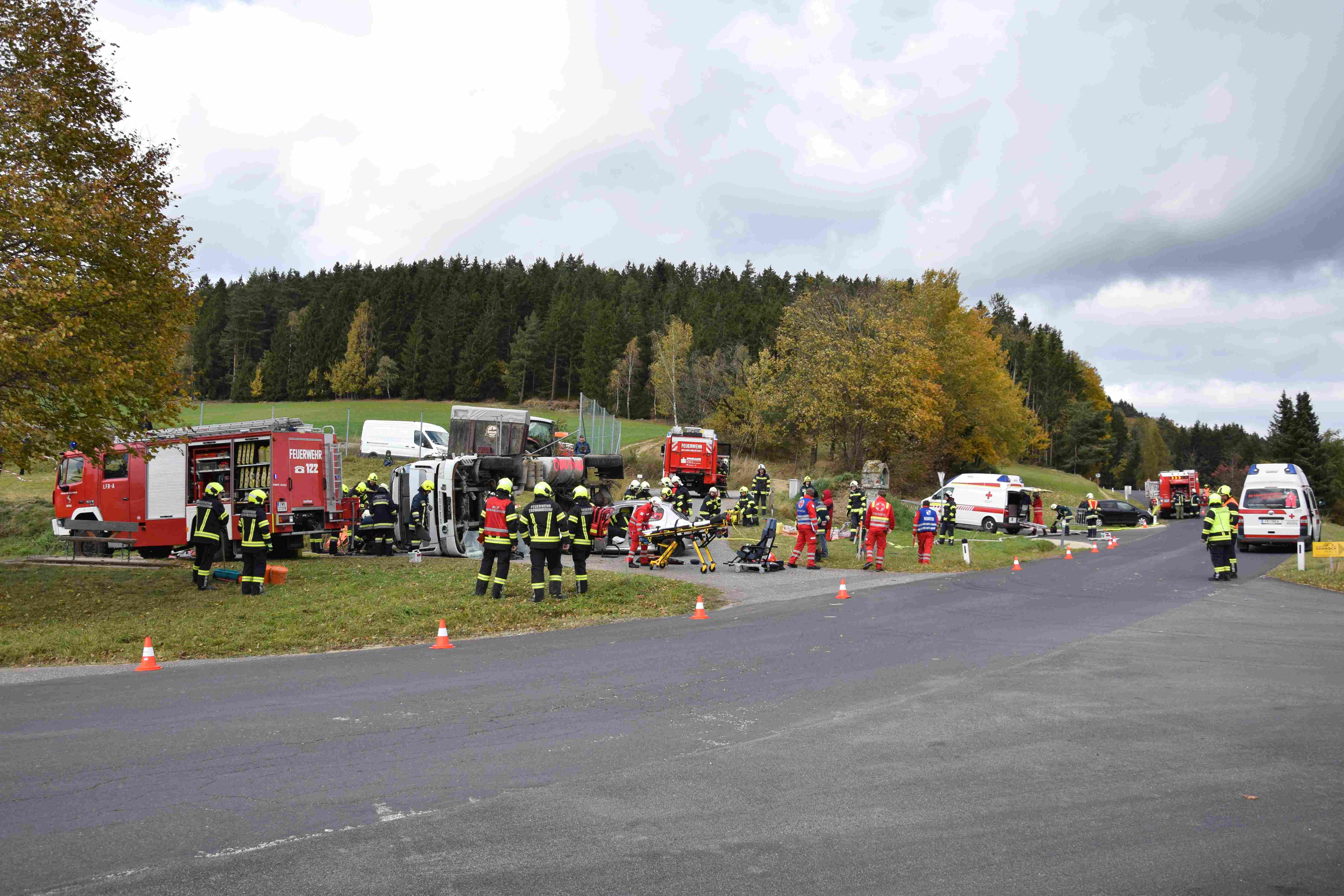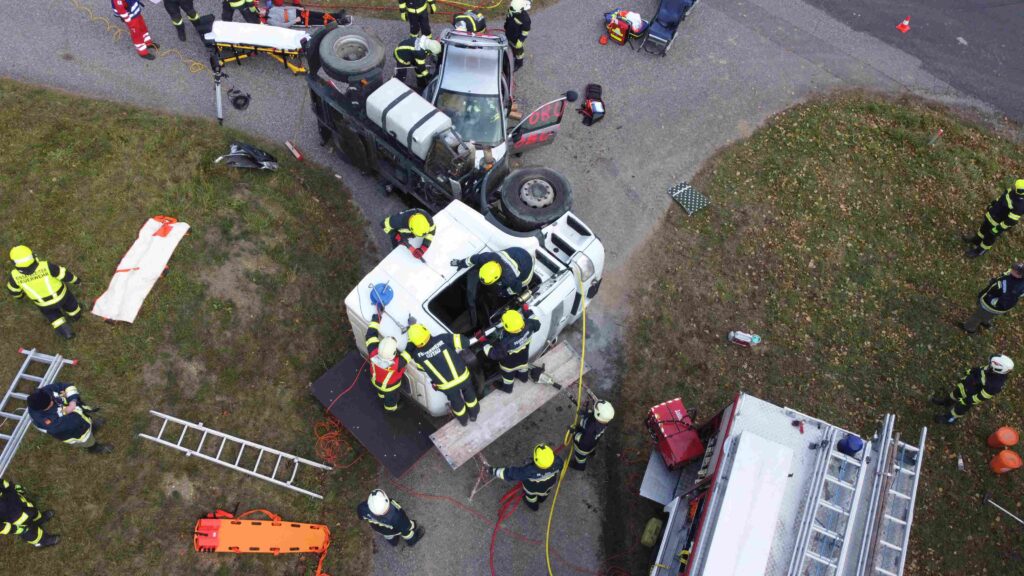 Ein heftiges Szenario stand für die Herbstübung 2021 in Erdmannsdorf am Programm: Schwerverletzte und eingeklemmte Verkehrsverunfallte mussten darum fürchten, dass die Kraftfahrzeuge auch noch in Feuer aufgehen.
