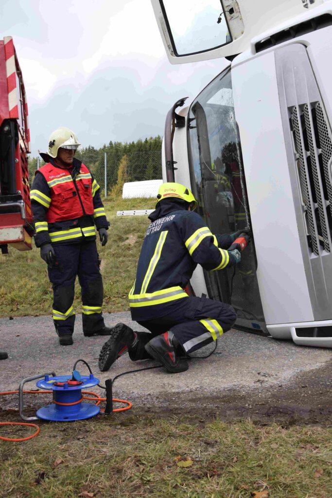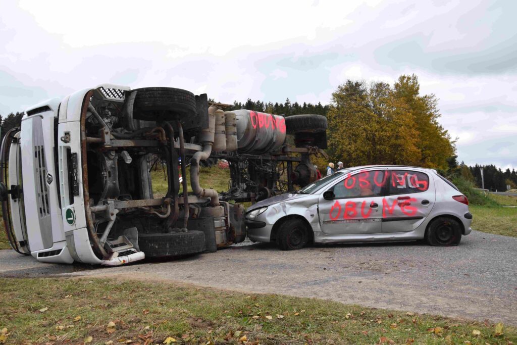 Angenommes Übungszenario: Verkehrsunfall mit eingeklemmten Personen nahe der ehemaligen Schule in Fürling – vorgefundene Lage: Ein PKW war in einen Lastwagen gekracht. Der war zwar mit keinem Gefahrengut beladen, doch durch den starken Aufprall auf die Seite gekippt. Darin eingeklemmte, noch um Hilfe rufende Insassen. Die Zugmaschine und das Auto brannten zwar nicht, man musste aber damit rechnen, dass das jederzeit der Fall werden könnte.