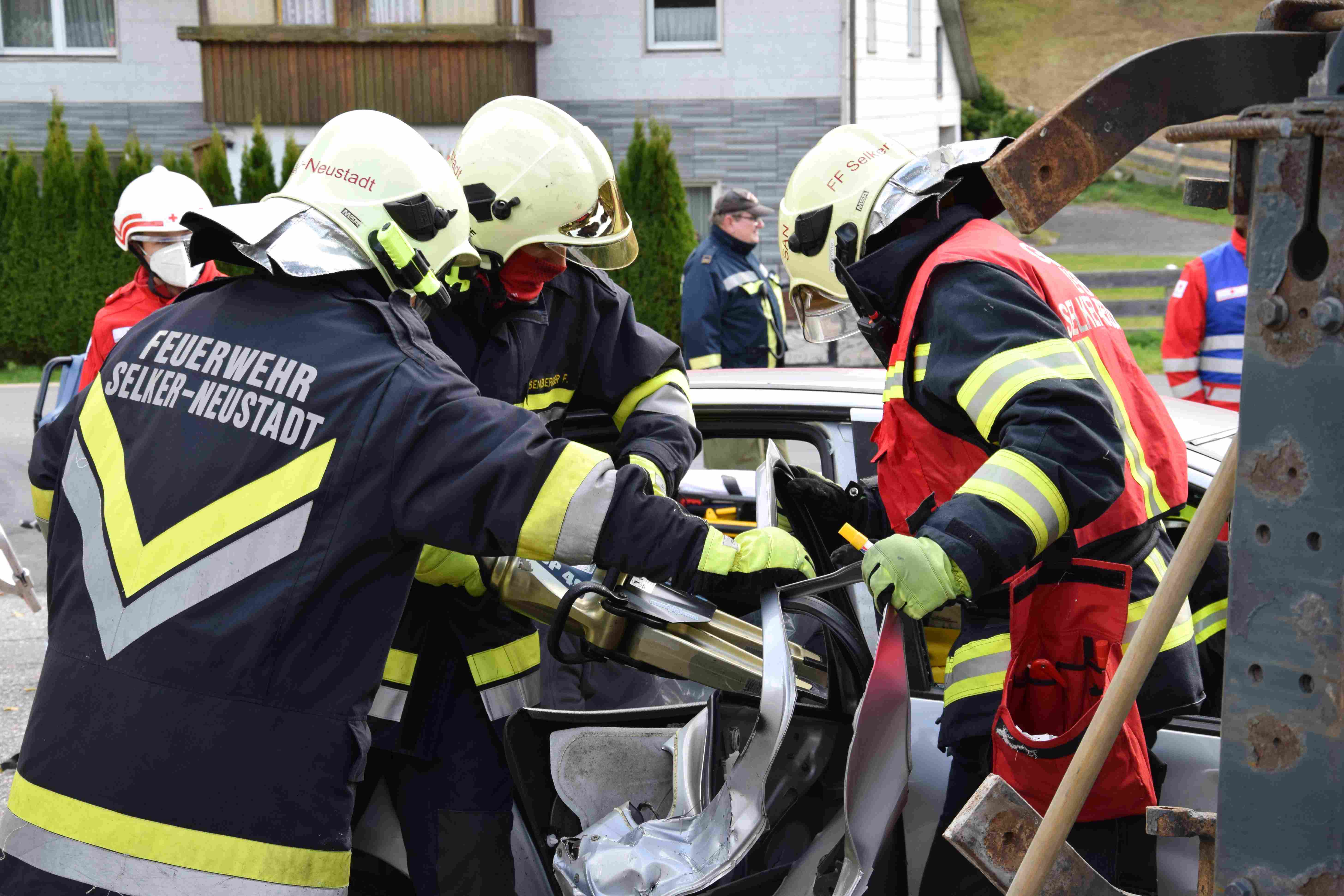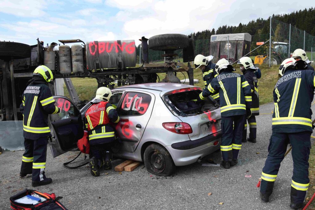 Die FF Selker-Neustadt wurde mit der Befreiung von zwei eingeklemmten Personen aus dem PKW betraut. Nur mittels hydraulischem Rettungssatz (Spreizer und Schere) konnten jeweils eine hinten und eine am Beifahrersitz befindliche Person befreit werden. Dabei galt es auf eventuelle, durch den Aufprall verursachte Nacken- und Wirbelsäulenverletzungen zu achten. In diesem Fall steht eine schonende, achsengerechte Rettung im Vordergrund, um weitere schwere Verletzungen an der Wirbelsäule zu vermeiden.